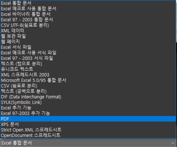 4) 클릭하면 무수히 많은 파일 형식들이 나타납니다. PDF를 찾아봅시다!