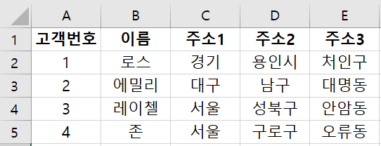 그럼 주소3 옆에 "주소"라는 새로운 컬럼을 만들고 주소1~3까지를 하나의 셀에 넣어 봅시다!