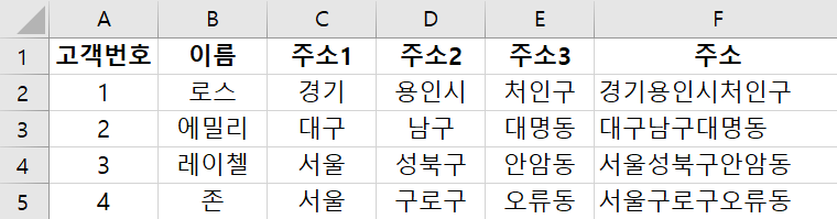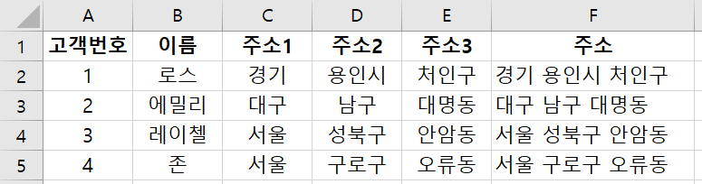 =C2&" "&D2&" "&E2 를 F2에 넣어주면, 우리가 의도했던 것처럼 주소 형식으로 출력될 것입니다.